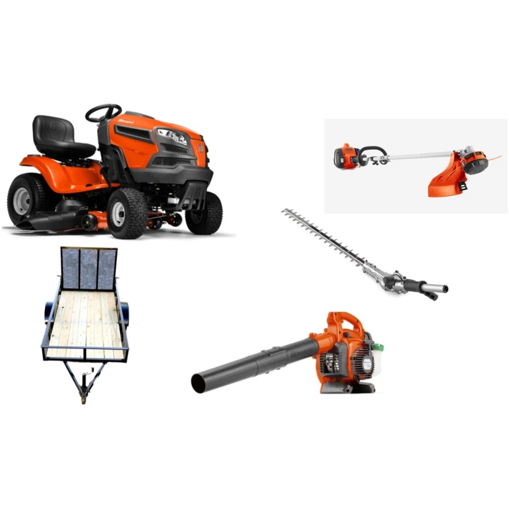 The HH114 Husqvarna Tractor Bundle includes the Husqvarna YTH24V48 Lawn Tractor, a Husqvarna blower, and a Husqvarna trimmer (with a hedging attachment) for all you need to care for your yard in one small package. Keep it all safe and ready to travel with a Caliber trailer, also included in this bundle.