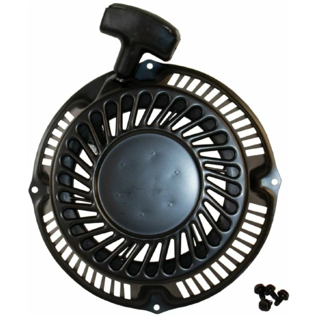 This rewind starter is an authentic OEM sourced item that is specially made for Briggs and Stratton engines. This is the starter assembly that is used to pull-start the unit. It is a complete assembly which includes a plastic shroud, starter pulley, recoil spring, grip, the pull rope with a grip and the hardware secure this assembly. To complete this repair you will need a wrench.